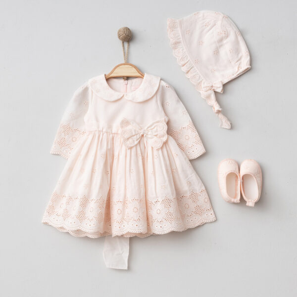 ნაკრებშია: კაბა, ბონეტი, წელწინდა, ფეხსაცმელი;