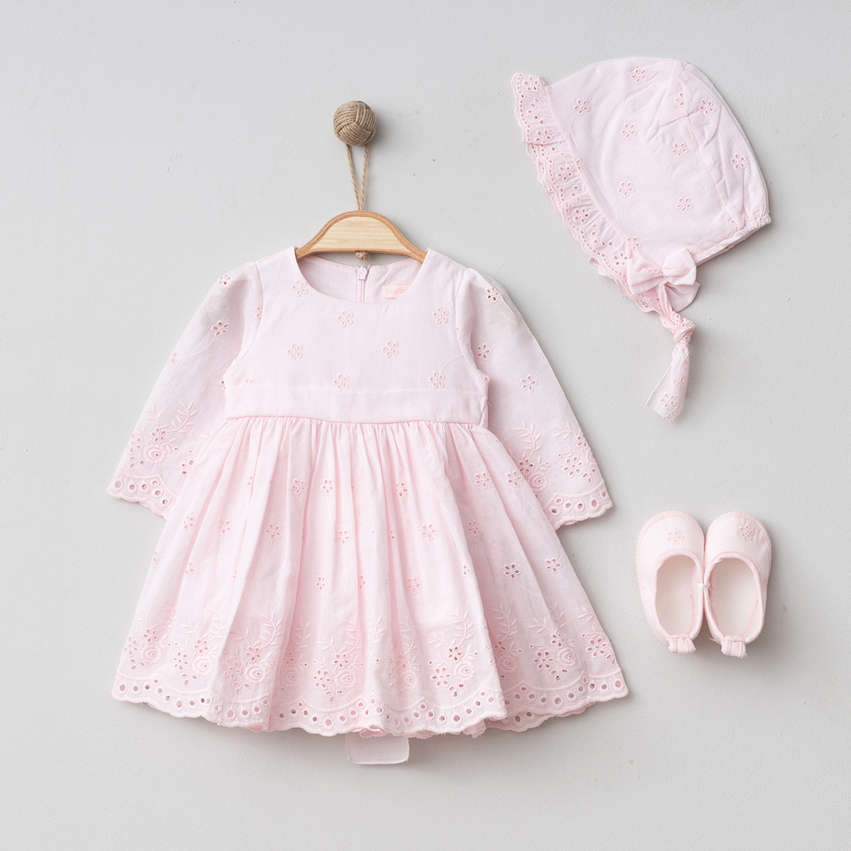 ნაკრებშია: კაბა, ბონეტი, წელწინდა, ფეხსაცმელი;